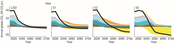 I IPCC:s modeller analyseras många olika scenarier, med varierande grad av framgång gällande minskningen av fossila bränslen och utbyggnaden av CDR. Praktiskt taget alla scenarier förutser användning av BECCS, vilket också väntas stå för huvuddelen av CDR‑volymerna.