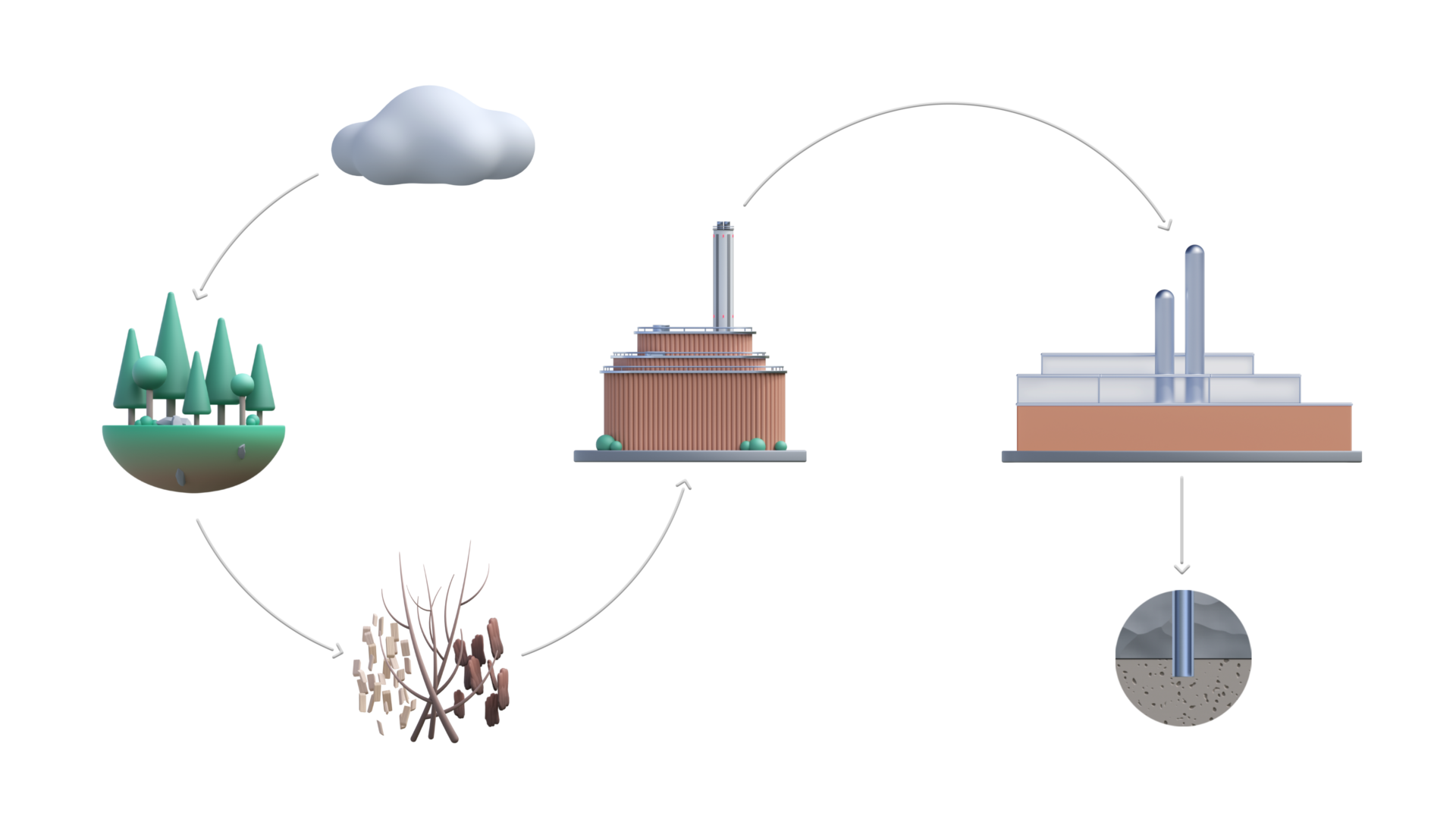 För BECCS baseras koldioxidborttagningen på infångning av biogen CO2. I det naturliga kretsloppet konsumerar träd CO2 genom fotosyntes och lagrar den. När skogsrester används för bioenergi släpps CO2 åter ut. Med BECCS fångas denna CO2 in och släpps inte tillbaka till atmosfären. Eftersom CO2 lagras blir nettoeffekten en minskning av koldioxid i atmosfären.