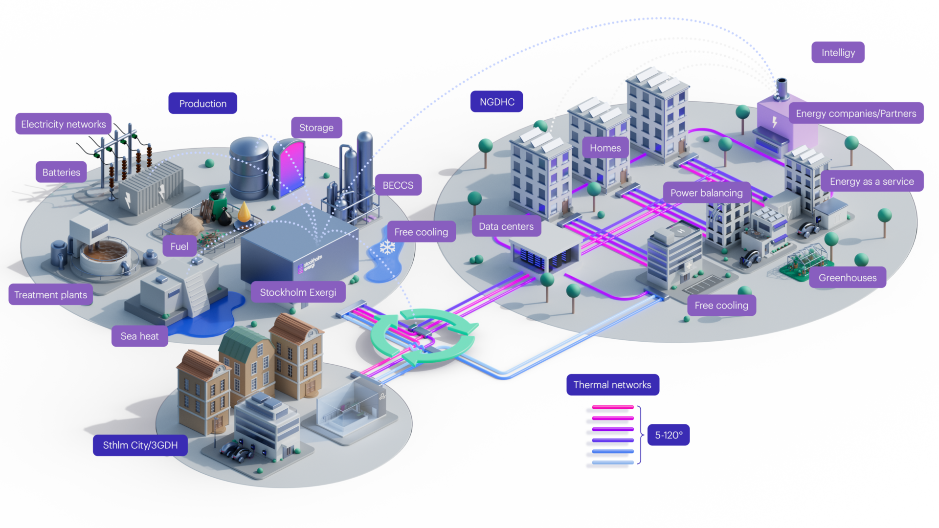 Lower operating temperatures enable the use of residual heat from multiple sources. Lower temperatures make it possible to use what is known as “low-value energy” – customers’ waste heat can be used and shared between properties and from customer to customer, for example. At the same time, extensive use of digitalisation and system optimisation in all areas from production, distribution and customers, creates “real value” within circular processes.