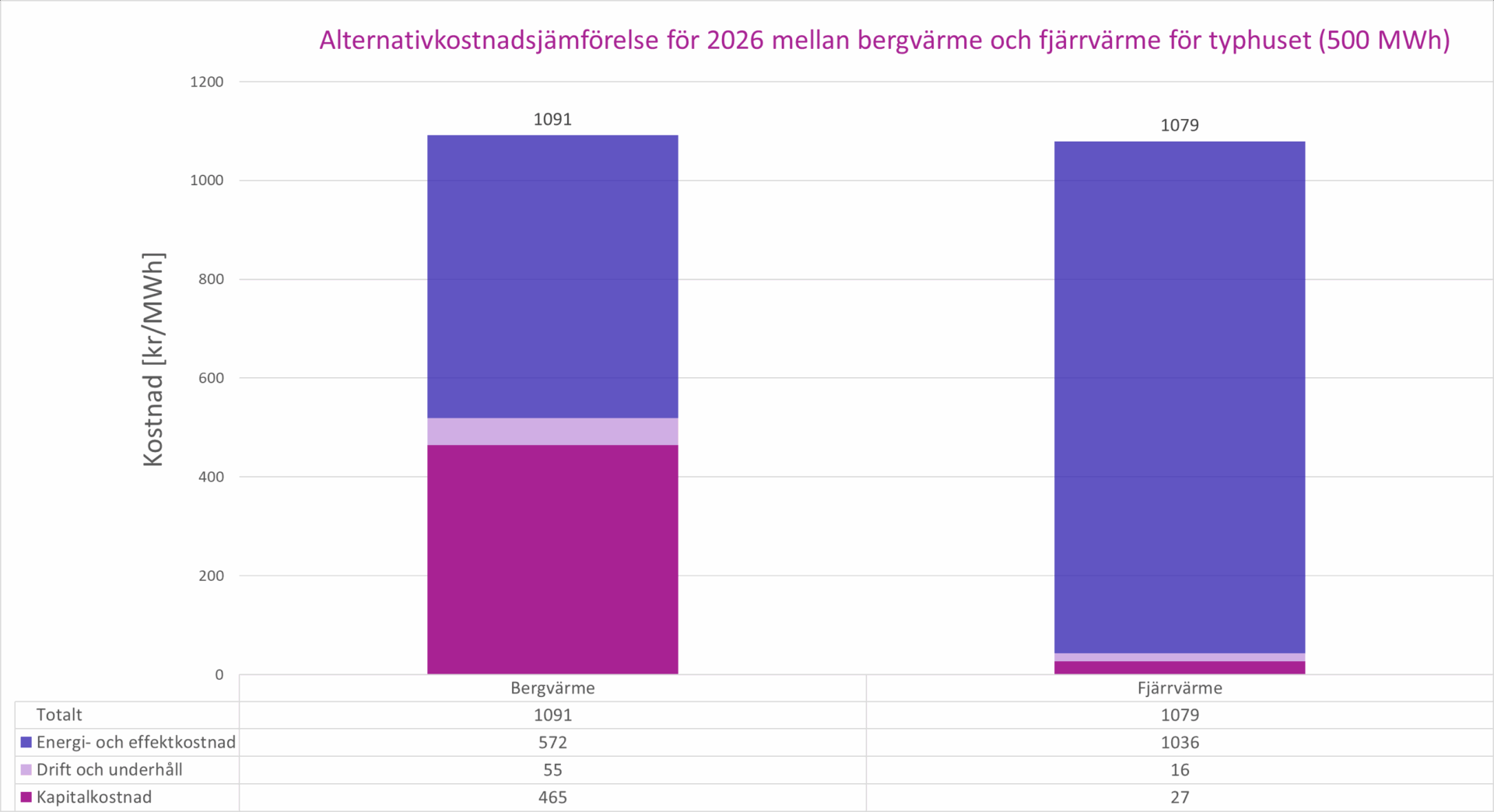 I grafen kan du se en jämförelse av 2026 års uppskattade totalkostnad vid uppvärmning med bergvärme med elspets och med vår fjärrvärme. Den uppskattade totalkostnaden gäller för ett flerbostadshus med en årlig energianvändning på 500 MWh, vilket motsvarar runt 50 lägenheter. Den vänstra stapeln är ett flerbostadshus som använder bergvärme, med elspets, där elspetsen normalt används under kalla dagar. Den högra stapeln är ett flerbostadshus som använder vår fjärrvärme.