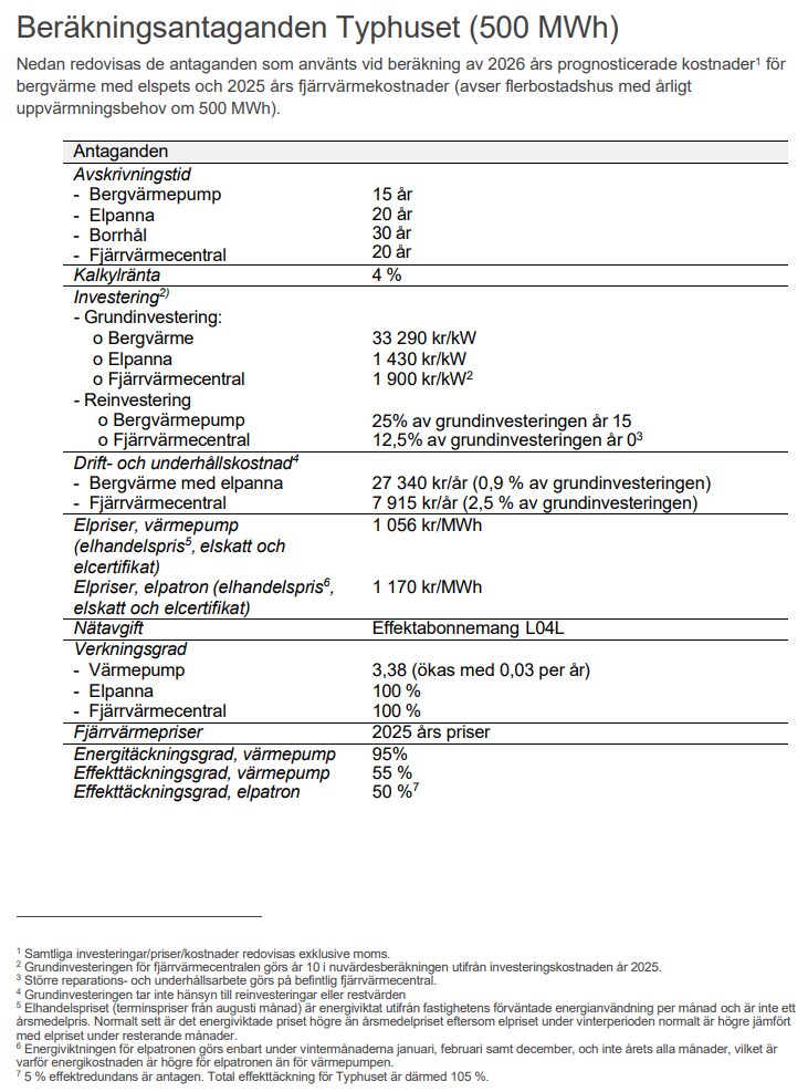 När vi uppskattar totalkostnaderna med bergvärme och fjärrvärme gör vi en nuvärdesberäkning där vi tar hänsyn till räntor, investering/reinvestering, fjärrvärmepriser, elpriser och nätavgifter och dessutom verkningsgrad, energitäckningsgrad samt drift- och underhållskostnader. Längst ner på sidan ser du våra antaganden som vi använder vid uppskattning av totalkostnaden.1)
