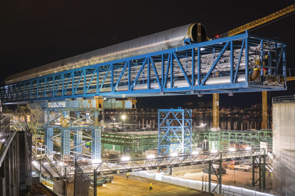 Natten mellan den 17 och 18 april lades den på plats – den 92 meter långa och drygt 300 ton tunga rörbro som ska leda rökgaserna från KVV8 till Bio-CCS-anläggningen i Energihamnen.