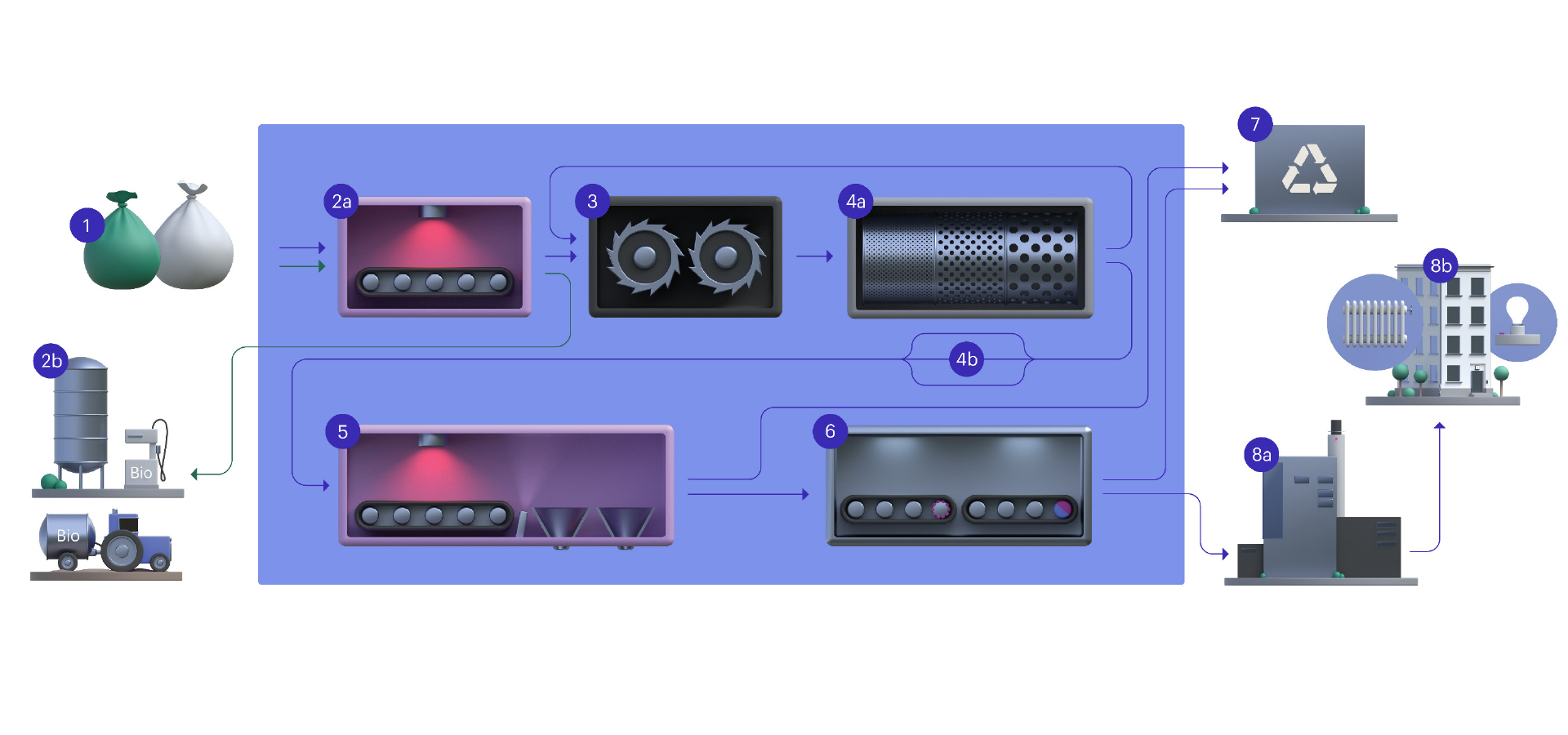 Det restavfall som återstår, efter utsortering av organiskt material (gröna påsar), plast och metall, och som inte går att materialåtervinna, går via ett transportband in i Stockholm Exergis mellanlagringsstation vid förbränningsanläggningen alternativt till containers.