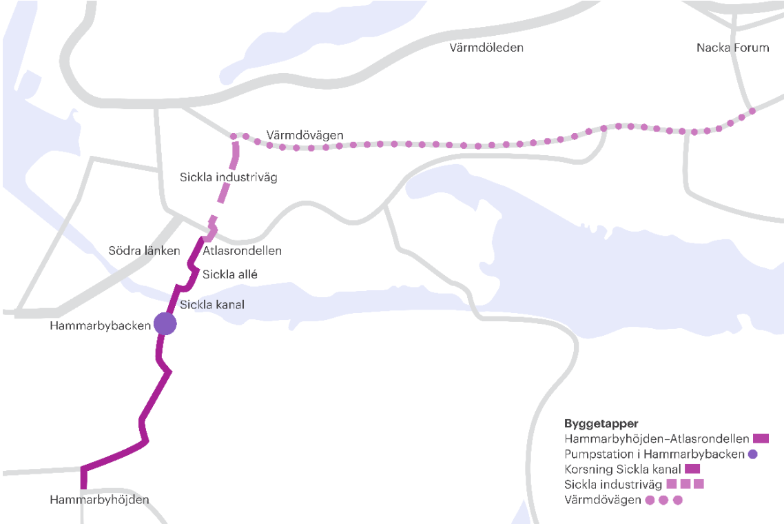 Nacka kommun planerar för minst 20 000 nya bostäder och 15 000 nya arbetsplatser fram till 2030. För att möta kommunens ökade värmebehov bygger vi en cirka fyra kilometer lång fjärrvärmeledning från Hammarbyhöjden till centrala Nacka med kapacitet att värma över 70 000 hushåll. Från huvudledningen drar vi några ledningar till befintliga och nya områden. För att kunna trycka ut vattnet i fjärrvärmeledningarna till fastigheter i Stockholm och Nacka bygger vi en ny pumpstation i Hammarbybacken. Pumpstationen blir cirka 500 kvadratmeter och till stor del integrerad i backen.