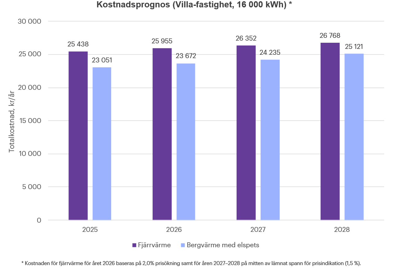 I grafen nedan redovisas en jämförelse av årliga totalkostnader för en villa-fastighet med en årlig energianvändning på 16 MWh, under åren 2025–2028. Grafen jämför Stockholm Exergis fjärrvärme enligt Normalprislista Villa & mindre fastighet med det vanligaste konkurrerande alternativet – bergvärme med kompletterande elspets för riktigt kalla dagar.