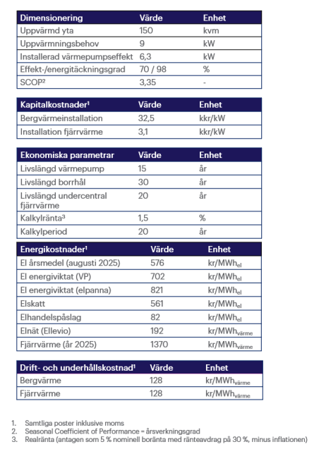 Nedan redovisas de antaganden som använts vid beräkning av 2026 års prognosticerade kostnader för fjärrvärme och bergvärme med elspets (avser Villa-fastighet med årligt uppvärmningsbehov om 16 MWh).